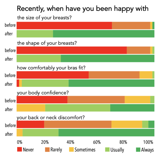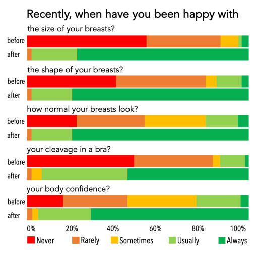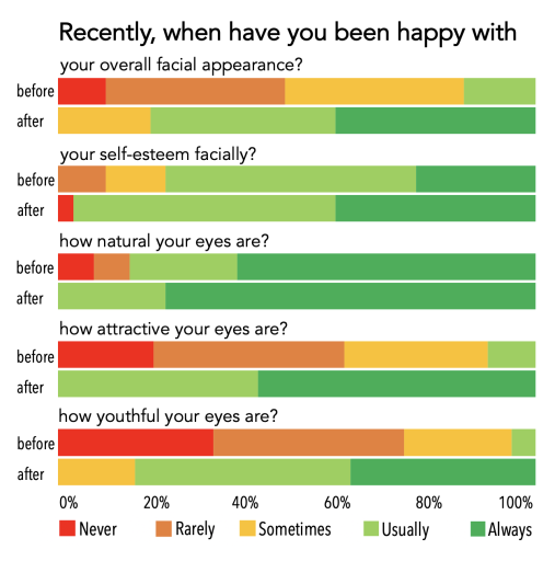 Patient reported outcome measures are an important part of contemporary surgery and reflect the subjective experience of patients undergoing surgery. This data is collected on all my patients before surgery and within a year following their surgery. Beyond objective or photographic criteria, this information reflects the personal experience of patients who have undergone surgery and their feelings about various aspects of their outcome.