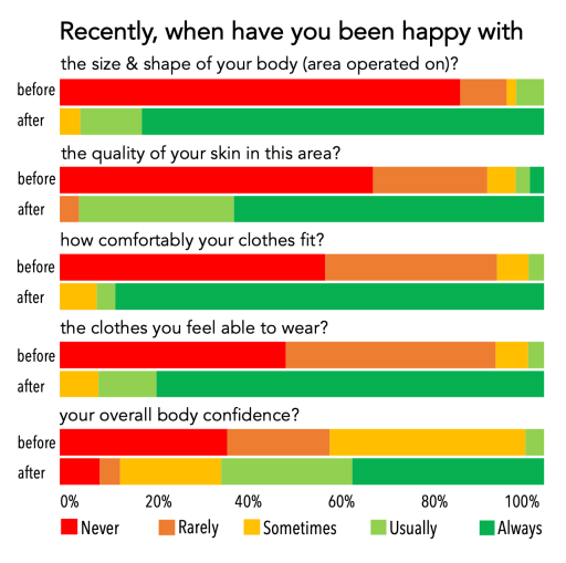 As you can see all these classes of operation show marked improvements in quality of life after surgery. In many cases the questionnaires reflect functional and symptomatic outcomes as well as a perception of aesthetics and beauty.